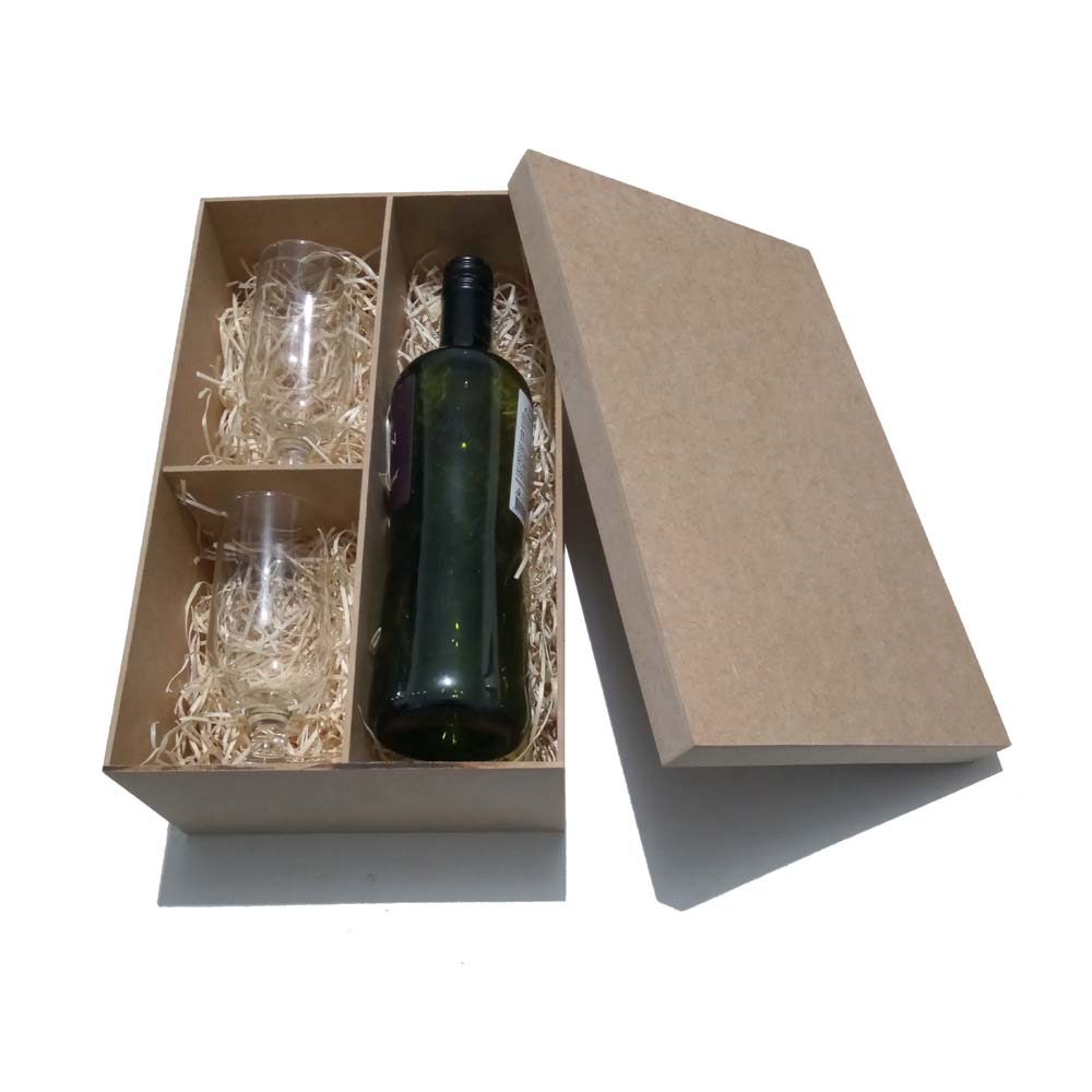 Com espaço ideal para uma garrafa de vinho e duas taças, a caixa cria uma apresentação impecável, protegendo os itens e transmitindo cuidado, bom gosto e alto valor percebido logo no primeiro olhar.